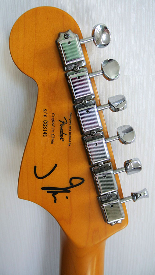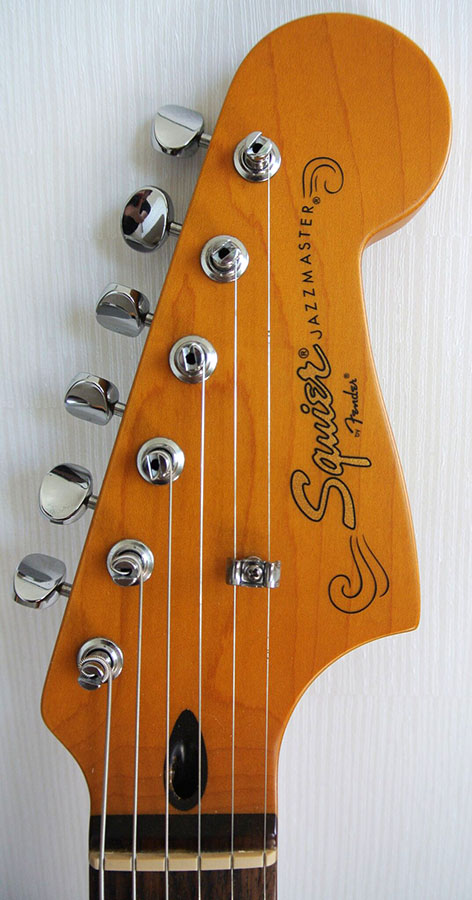 - Unique Features: J Mascis Signature on Back of Headstock, Large '60s-Style Jazzmaster Headstock, Gold and Black Squier Logo, Squier Engraved Neckplate, Aged White Plastic Parts and Aged White Dot Position Inlays Aged White Plastic Control Knobs and Black Knurled Knobs
