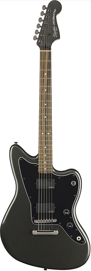 "True to the Jazzmaster tradition of smashing rules, the Squier Contemporary Active Jazzmaster is packed with audacious new features. Sporting a matching headstock for a sleek aesthetic and black chrome hardware for a stealthy vibe, this guitar looks as sinister as it sounds.