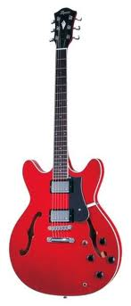 "The Squier Starfire Guitar is a double cutaway semi-hollow body guitar with a maple top, back and sides. The set maple neck has a rosewood fingerboard has jumbo nickel silver frets and dot inlays, and a 24 3/4" scale length. This guitar features two Seymour-Duncan designed humbucking pickups and is available in Natural and Crimson Transparent."