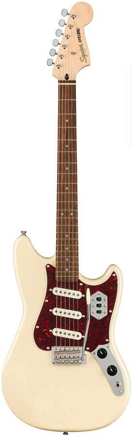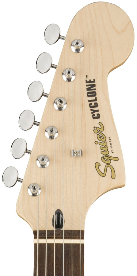 - Other Features: Black Plastic Control Knobs, Pearloid Dot Inlay Positions, Gold Squier Logo, Cyclone on Headstock in Black, Single String Tree