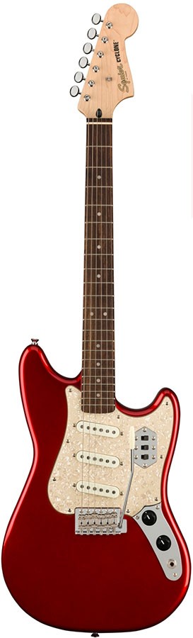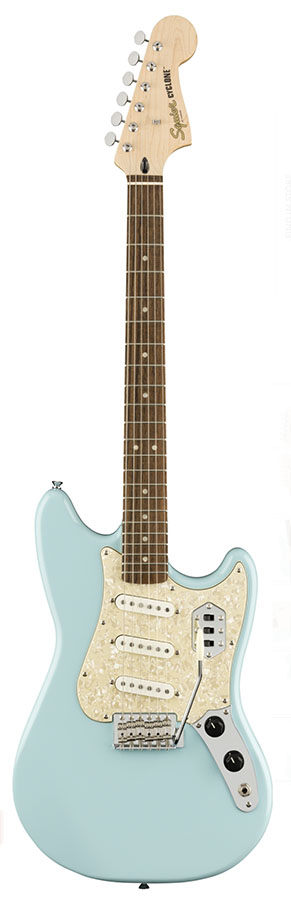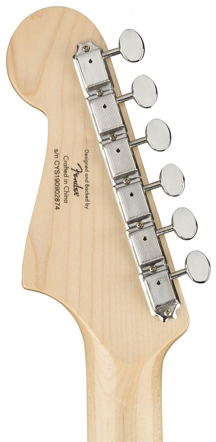 - Other Features: Black Plastic Control Knobs, Pearloid Dot Inlay Positions, Gold Squier Logo, Cyclone on Headstock in Black, Single String Tree