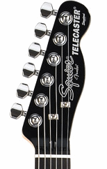 "The Squier Black and Chrome Series Standard Telecaster guitar is edgy, but with classic appeal. Features include two single-coil pickups, three-way switching, a gloss black finish with matching headstock, and pickguards and hardware with that much sought-after chrome look."