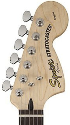 - Unique Features: Large '60s Style Headstock, Gold and Black Squier Logo, Squier Engraved Neckplate, Parchment Plastic Parts, White Dot Position Inlays, Dual Wing-Style String Trees